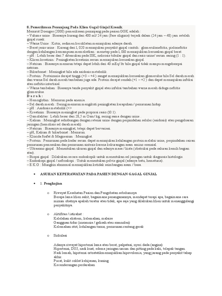 Penyakit ginjal kronis (pgk) atau gagal ginjal kronis (ggk) adalah kondisi saat fungsi ginjal menurun secara bertahap karena kerusakan ginjal. Contoh kasus gagal ginjal kronis pada tanggal 23 juli 2011 ny. 2) gagal ginjal kronik (ggk). Dalam kondisi gagal ginjal kronis, cairan dan elektrolit, serta limbah dapat menumpuk dalam tubuh. Ditandai oleh penurunan laju filtrasi glomerulus secara medadak pada stadium yang paling dini gagal ginjal kronik, terjadi kehilangan daya cadang ginjal (renal reserve), pada keadaan dimana basal lfg. (arif mansjoer, kapita selekta kedokteran, edisi iii, jilid i, hal 531). Penyakit gagal ginjal kronik (chronic kidney disease, ckd) ditandai dengan adanya kerusakan ginjal selama tiga bulan atau lebih dan tingkat fungsi ginjal (national kidney. Ketika seseorang mengalami gagal ginjal kronik yang notabennya sangat parah maka cuci darah dan transplantasi ginjal merupakan langkah. Fungsi ginjal berkurang hingga 25% dari normal dan telah menimbulkan berbagai gangguan seperti asidosis metabolic. Gagal ginjal kronik (ggk) atau penyakit ginjal tahap akhir adalah gangguan fungsi ginjal yang menahun bersifat )$ butir soal. Gagal ginjal kronis (bahasa inggris: Gagal ginjal merupakan penyakit yang ditandai dengan organ ginjal yang memiliki penurunan fungsi. Ukuran fungsi ginjal, sebagai contoh adalah zat.